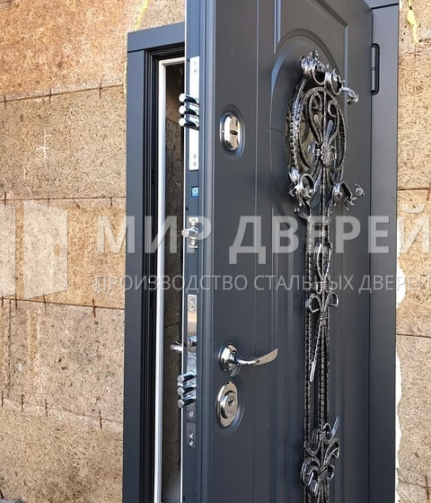 Дверь предлагает возможности персонализации: выбор отделки, дополнительное оснащение зеркалами, стеклопакетами или коваными элементами, а также установка современных биометрических замков и видеодомофонов по желанию заказчика, что делает каждую дверь уникально адаптированной под нужды и предпочтения ее владельца.